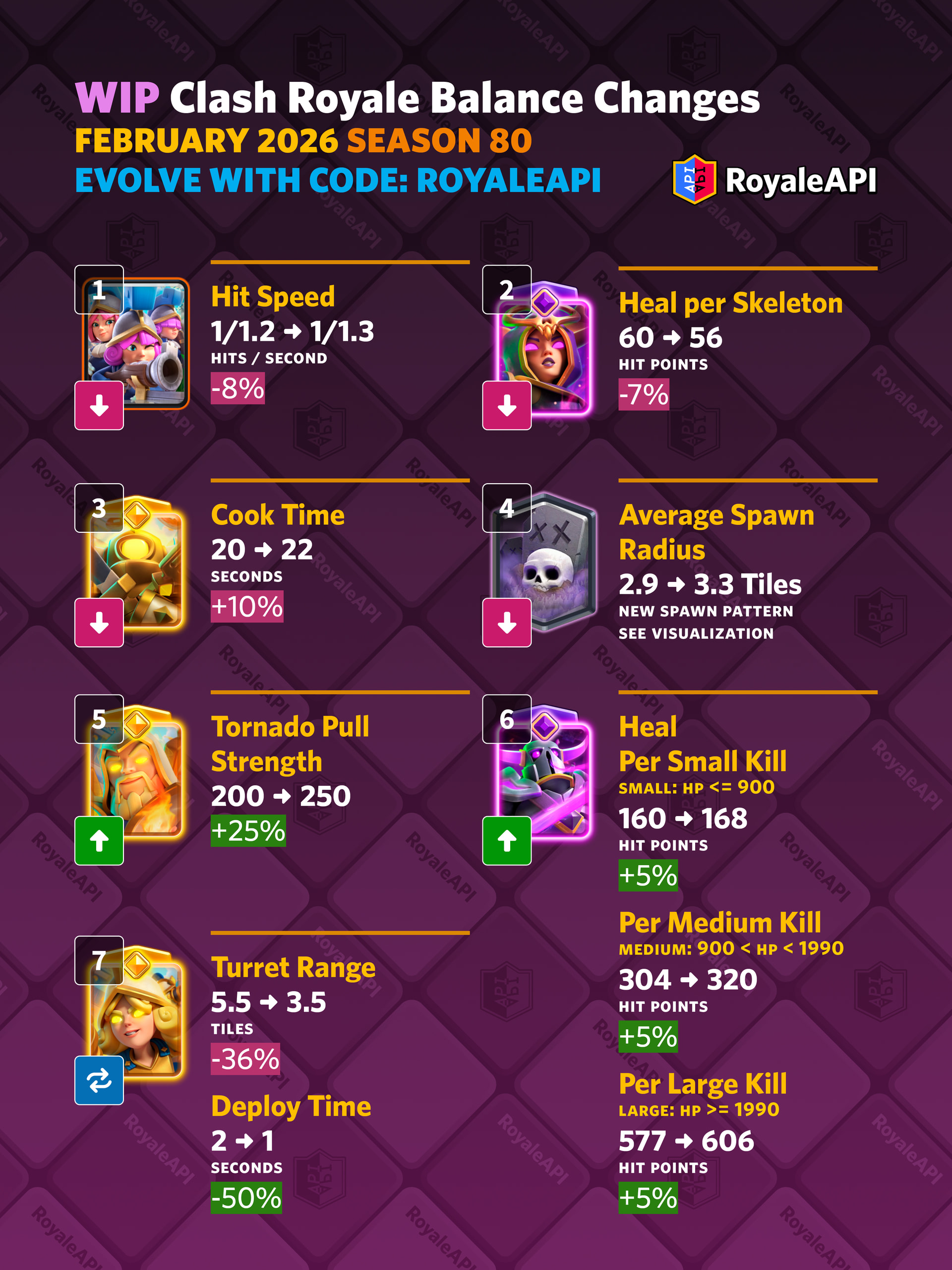 The Work In Progress (WIP) changes for February 2026 have arrived. For now, 7 cards have been picked to receive buffs and nerfs, but the final list may be different. The results of these polls will be sent to Supercell and will be taken into account for the final list of changes.